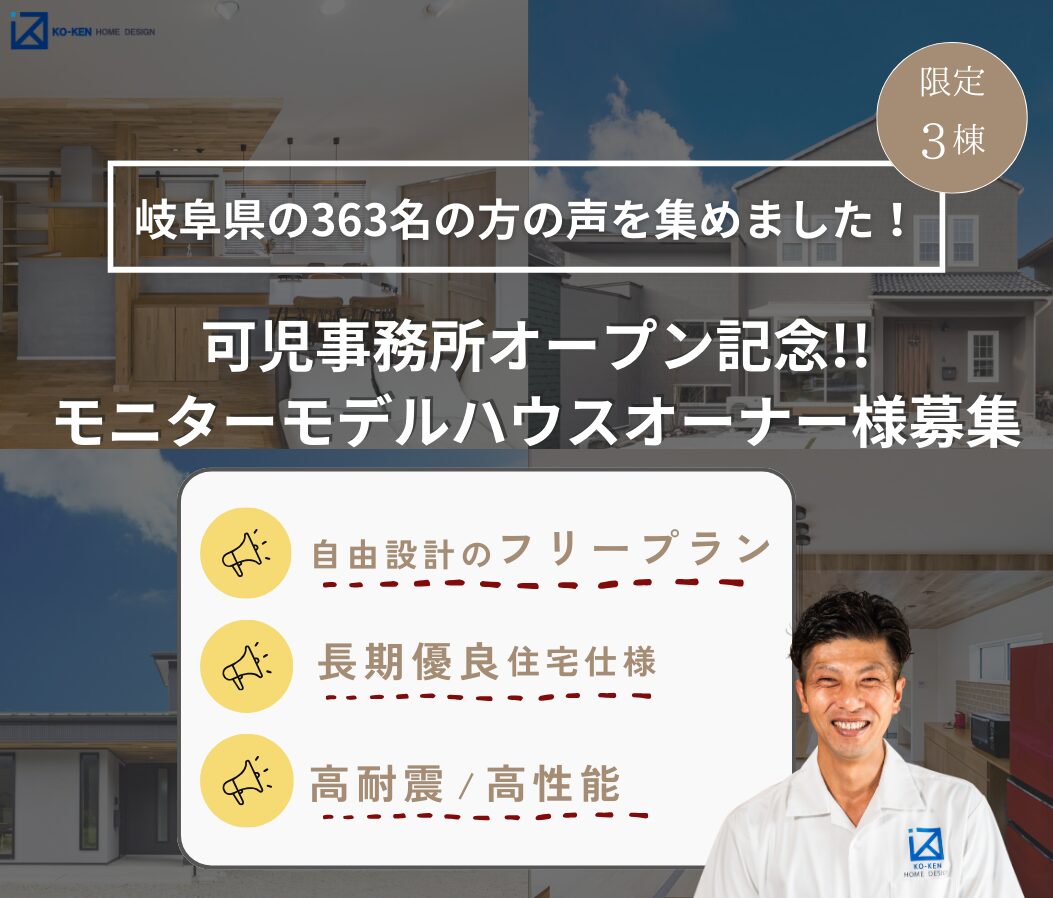 | 備考 | ■モニターハウス特典 ①オプション工事費100万円分 ②家具100万円分 ※①②いずれかをお選びください ■条件 ①下記のエリアで注文住宅をご計画の方 多治見市・可児市・美濃加茂市・関市・美濃市・各務原市・坂祝町・富加町・御嵩町・川辺町・八百津町・七宗町方 ②2024年4月30日(火)までにエントリー完了の方 ③完工後に一定期間の見学会開催や、インタビュー、写真撮影などにご協力いただける方 ■ご予約方法 ①お電話でのお申込み TEL : 0576-20-4497 ②WEB申込 下記よりお申込みください。 |