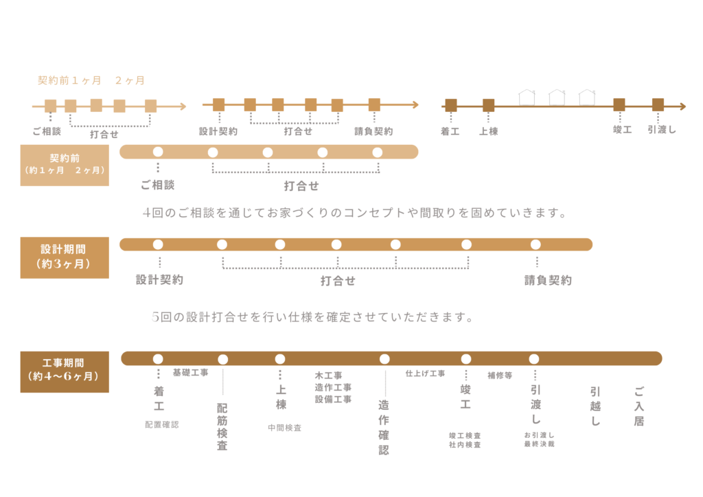 基本的にはプランに2ヶ月、仕様に2ヶ月ほどかかり、家が完成するのに10ヶ月ほどかかります。