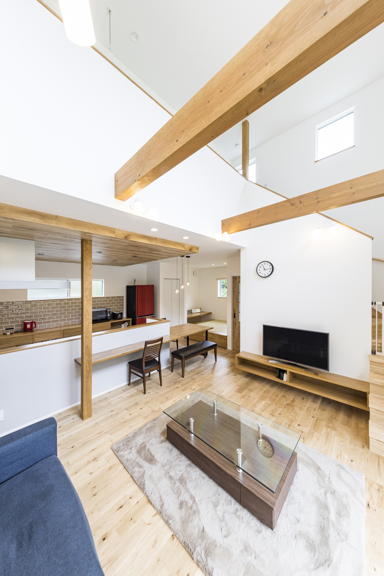リビングの吹き抜けや、天井の2本の梁が気に入っていて、見た目も良いのでリビングで過ごす時間がとても長くなりました。