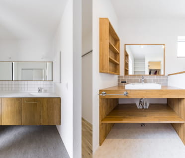 既製品の洗面だと奥行や幅、デザインに制限が出てきてしまいますが、造作洗面台は自由に調整することができます。洗面ボウル、水栓、ミラーキャビネット、収納などを自由に選んで、自分だけの洗面空間を作ることができます。